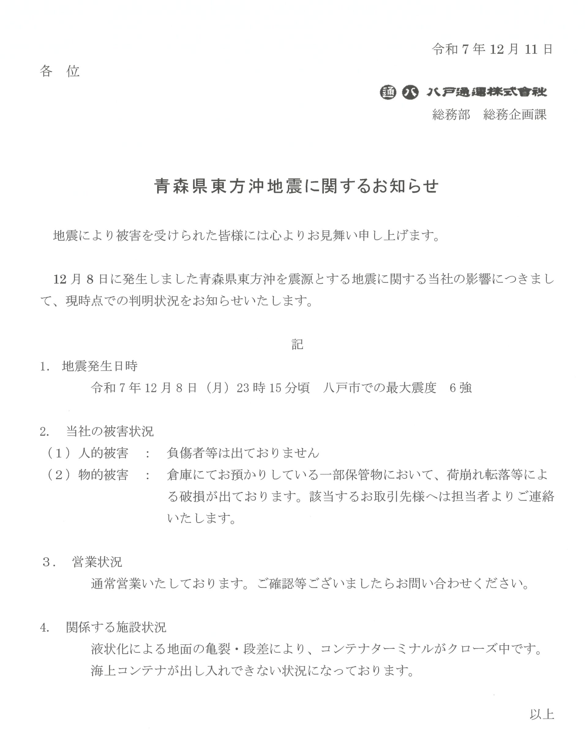 青森県東方沖地震に関するお知らせ